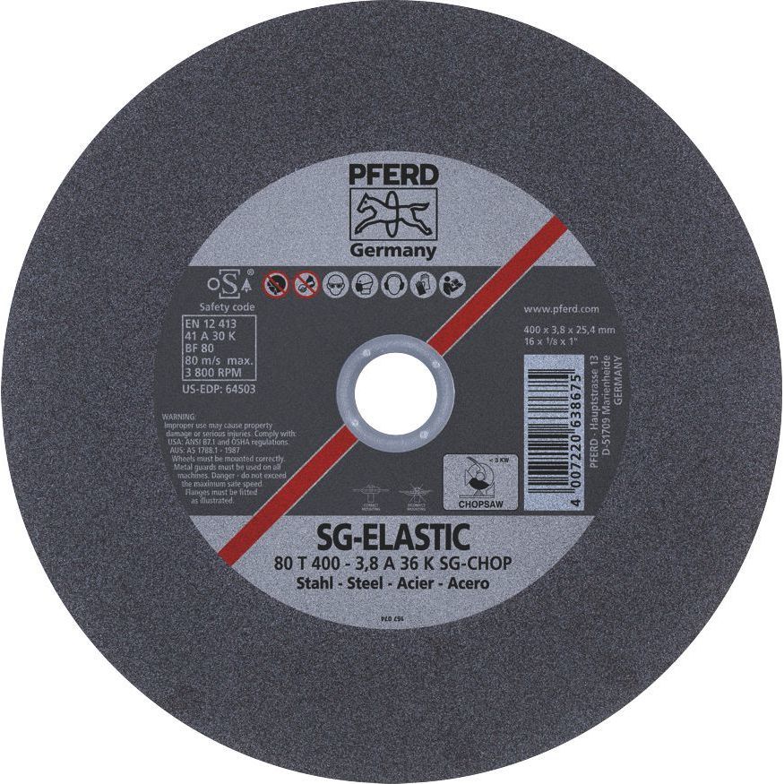 This PFERD cut-off wheel is part of the Performance Line SG, designed for use with chopsaws on steel. It delivers a high level of cutting performance and excellent tool life. With its hardness grade K and middle fabric construction, it ensures fast and aggressive cutting with minimal burr formation. Ideal for applications such as cutting solid steel, profiles, and pipes in fabrication and industrial environments.