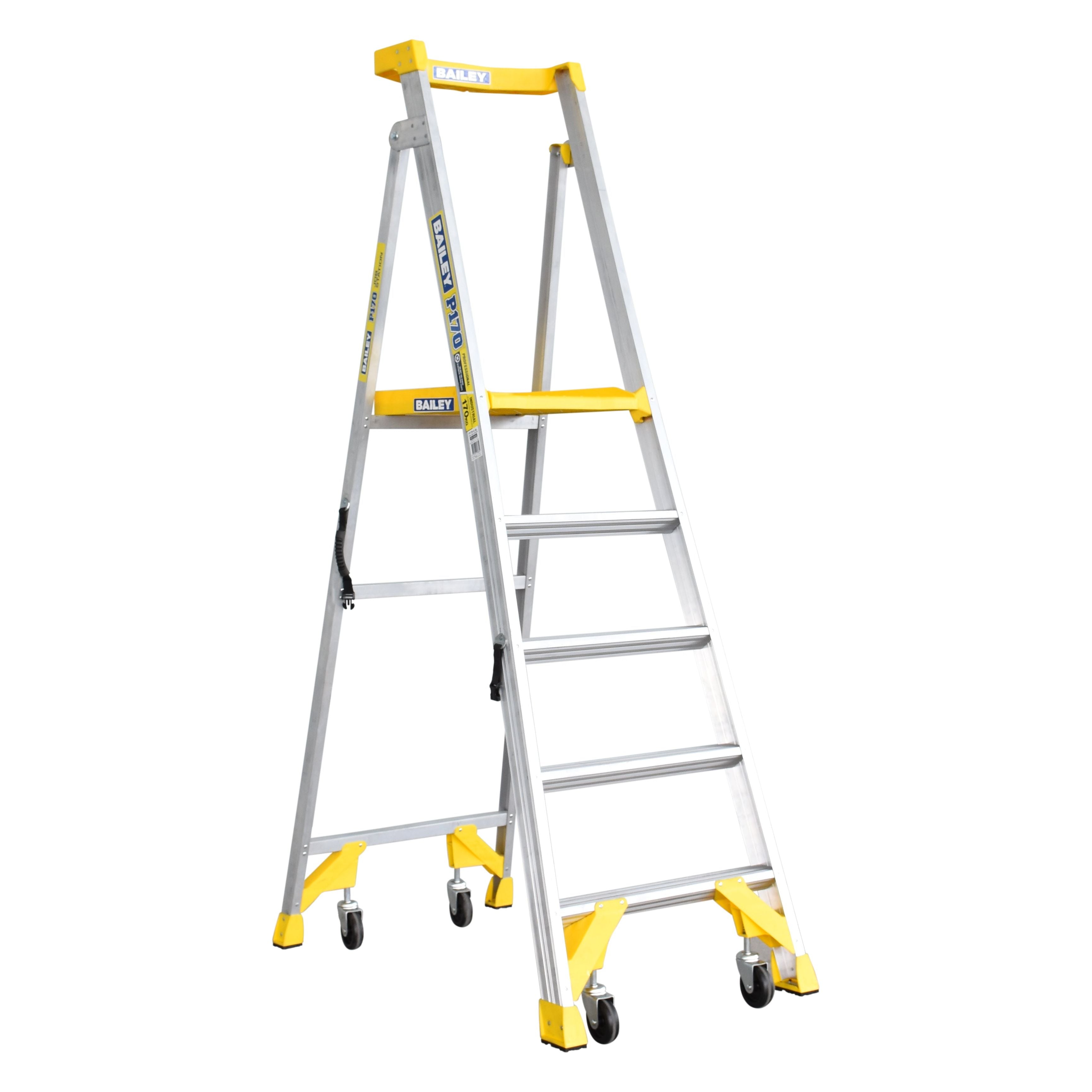 The Bailey P170 range of platform stepladders offers the largest in class platform measuring 610 X 457mm. With a 170kg load rate and industrial duty rating it is extremely durable and job site ready. Available in both aluminium and fibreglass, with a factory fitted carry handle and castor system it will improve safety and efficiency on your work site. Safety gates are available as an accessory.