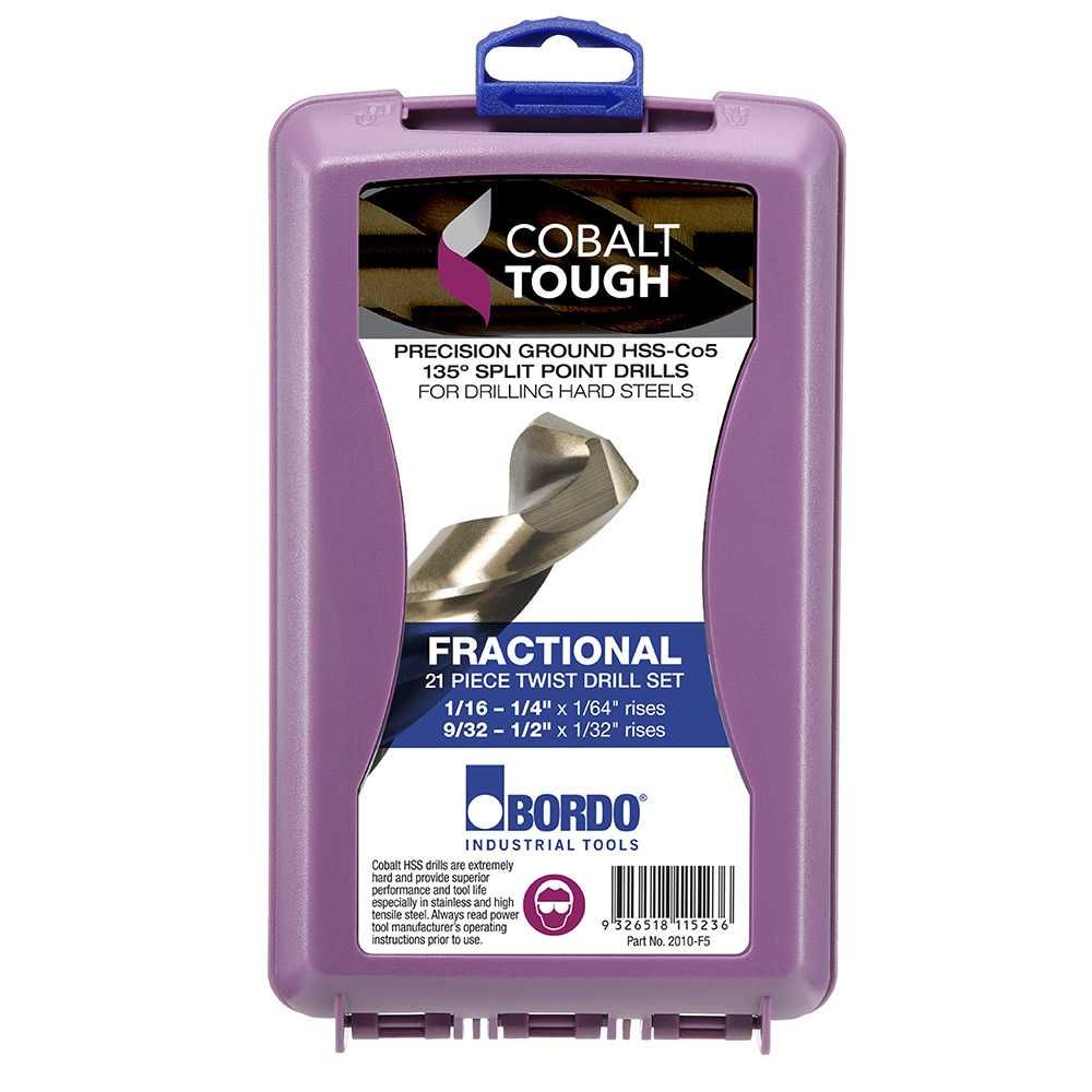 Introducing the Bordo 1/16-1/2" 21 Piece HSS Cobalt Drill Set—a must-have for any tradesperson or technician looking to elevate their drilling capabilities. This high-quality drill bit set is expertly crafted from HSS cobalt, ensuring exceptional durability and maximum performance in various industrial applications.