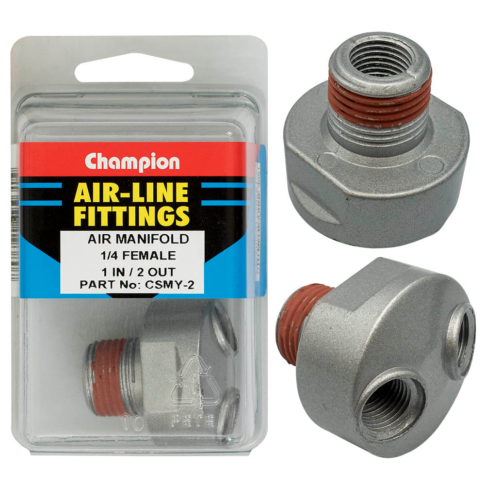 Industrial Shed proudly distributes Champion - AIR MANIFOLD 1-IN-2-OUT-1/4"-FEMALE | CSMY-2 by Champion Fasteners, delivering enhanced air distribution efficiency for your pneumatic tools and equipment.