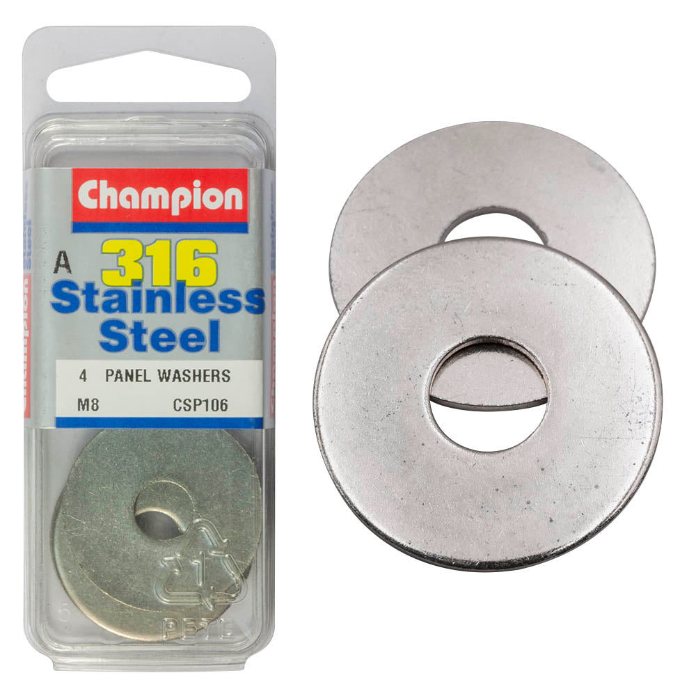 Industrial Shed proudly distributes Champion - BODY WASHERS-PANEL-STAINLESS STEEL-8mm-316/A4 | CSP106 by Champion Fasteners, delivering exceptional durability and corrosion resistance for a variety of applications. These stainless steel body washers are specifically designed to enhance the performance and longevity of your fastening projects.
