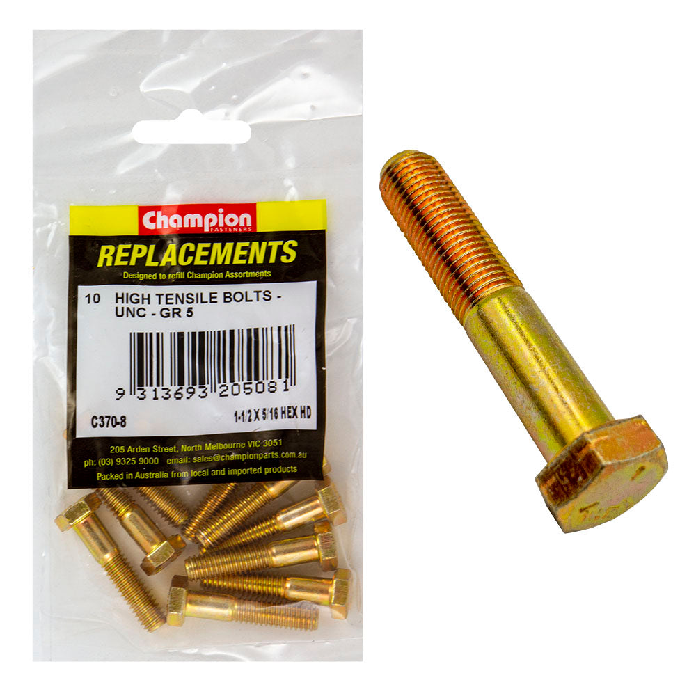 Industrial Shed proudly distributes Champion - HEX BOLTS-HIGH TENSILE-5/16" x 1-1/2"-UNC-GRADE 5 | C370-8 by Champion Fasteners, delivering superior strength and reliability for a wide range of construction and mechanical applications.