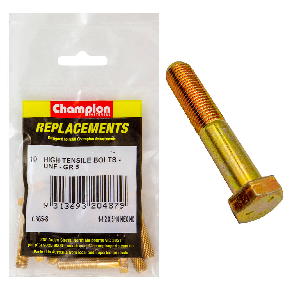 Industrial Shed proudly distributes Champion - HEX BOLTS-HIGH TENSILE-5/16" x 1-1/2"-UNF-GRADE 5 | C365-8 by Champion Fasteners, delivering exceptional strength and durability for demanding applications. These high-tensile hex bolts are perfect for construction, automotive, and heavy machinery use.