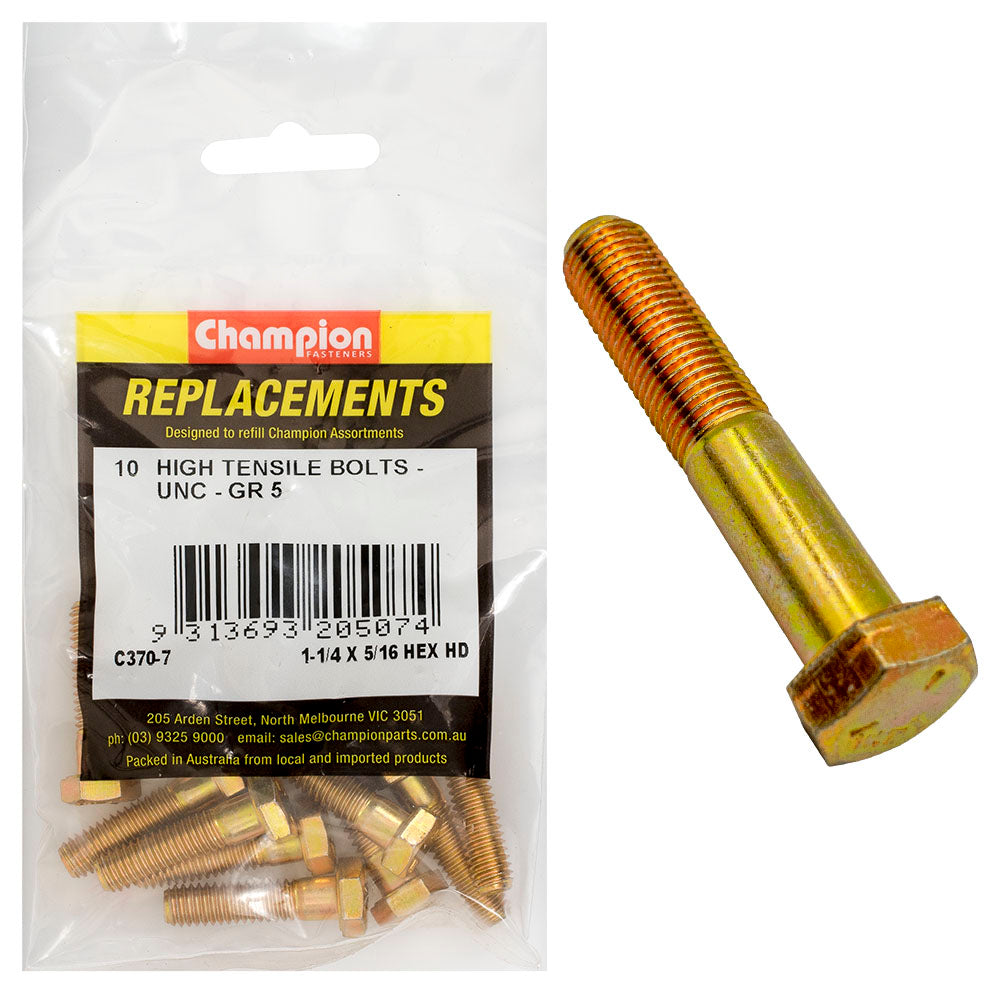 Industrial Shed proudly distributes Champion - HEX BOLTS-HIGH TENSILE-5/16" x 1-1/4"-UNC-GRADE 5 | C370-7 by Champion Fasteners, delivering exceptional durability and strength for various construction and industrial applications.