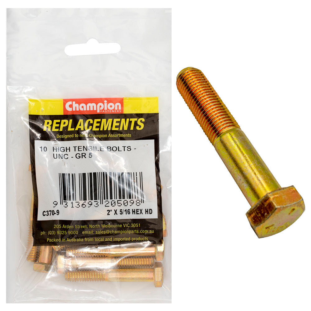 Industrial Shed proudly distributes Champion - HEX BOLTS-HIGH TENSILE-5/16" x 2"-UNC-GRADE 5 | C370-9 by Champion Fasteners, delivering unmatched strength and durability for a variety of industrial applications. These high tensile hex bolts are designed to withstand heavy loads and harsh conditions, making them ideal for construction, machinery assembly, and automotive repairs.