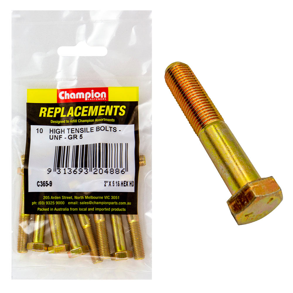 Industrial Shed proudly distributes Champion - HEX BOLTS-HIGH TENSILE-5/16" x 2"-UNF-GRADE 5 | C365-9 by Champion Fasteners, delivering exceptional strength and reliability for your construction and assembly needs. These high-tensile hex bolts are ideal for heavy-duty applications, ensuring your projects remain secure and stable.