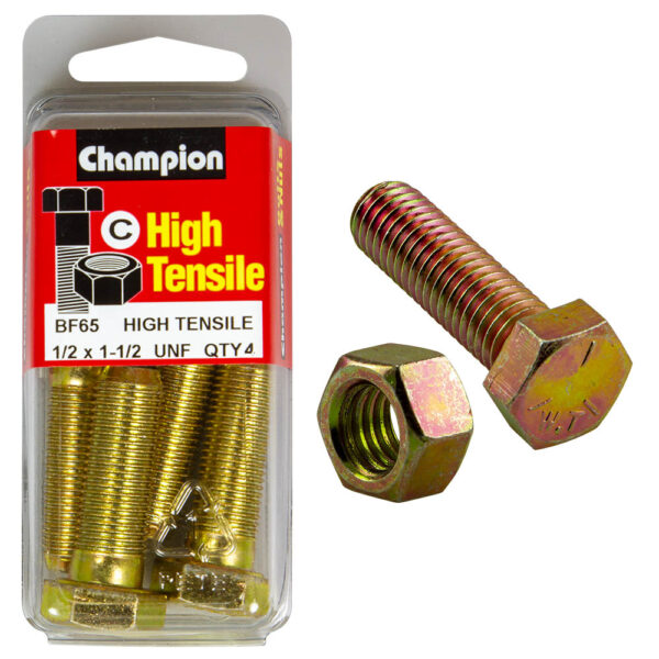 Industrial Shed proudly distributes Champion - HEX BOLTS & NUTS - HIGH TENSILE - 1/2" x 1-1/2" | BF65 by Champion Fasteners, delivering exceptional strength and durability for your heavy-duty fastening needs. These high tensile bolts and nuts are ideal for construction, automotive, and industrial applications where reliability is paramount.