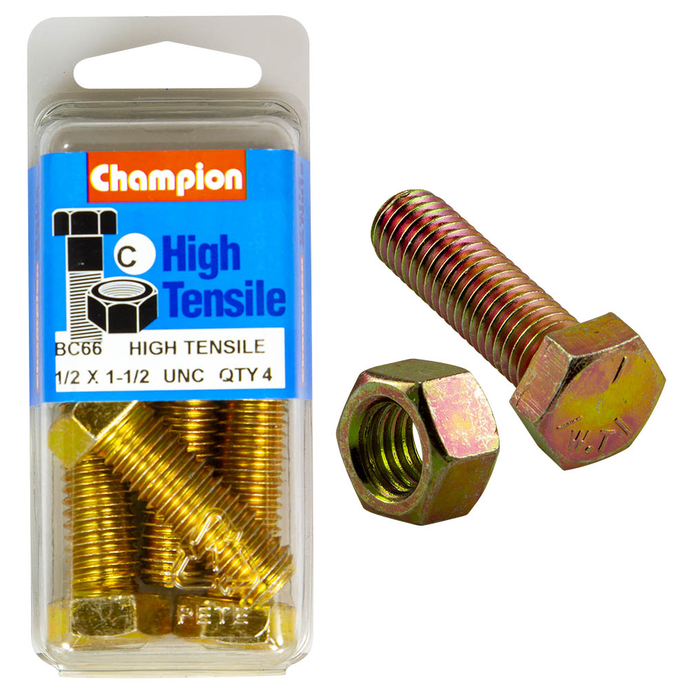 Industrial Shed proudly distributes Champion - HEX BOLTS & NUTS - HIGH TENSILE - 1/2" x 1-1/2" - UNC - GRADE 5 | BC65 by Champion Fasteners, delivering exceptional strength and durability for your heavy-duty fastening needs. These high tensile bolts are ideal for various industrial applications, ensuring reliable performance in demanding environments.