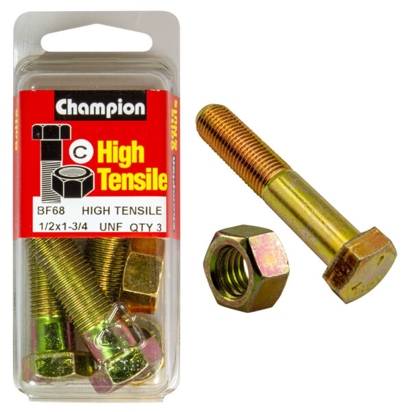 Industrial Shed proudly distributes Champion - HEX BOLTS & NUTS - HIGH TENSILE - 1/2" x 1-3/4" - UNF - GRADE 5 | BF68 by Champion Fasteners, delivering exceptional strength and reliability for your heavy-duty fastening needs.