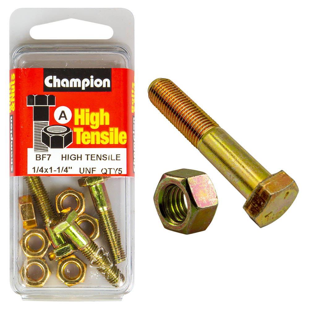 Industrial Shed proudly distributes Champion HEX BOLTS & NUTS - HIGH TENSILE - 1/4" x 1-1/4" - UNF - GRADE 5 | BF7 by Champion Fasteners, delivering exceptional strength and reliability for heavy-duty fastening applications.