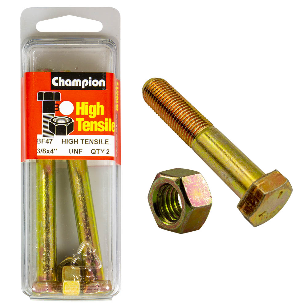 Industrial Shed proudly distributes Champion - HEX BOLTS & NUTS - HIGH TENSILE - 3/8" x 4" - UNF - GRADE 5 | BF47 by Champion Fasteners, delivering exceptional strength and durability for all your fastening needs. Designed for heavy-duty applications, these high tensile hex bolts and nuts are perfect for construction, machinery assembly, and automotive use.