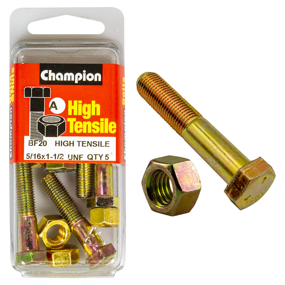 Industrial Shed proudly distributes Champion - HEX BOLTS & NUTS - HIGH TENSILE - 5/16" x 1-1/2" - UNF - GRADE 5 | BF20 by Champion Fasteners, delivering superior strength and reliability for heavy-duty applications. These high tensile bolts and nuts are designed to withstand demanding environments, making them ideal for construction, automotive, and industrial settings.