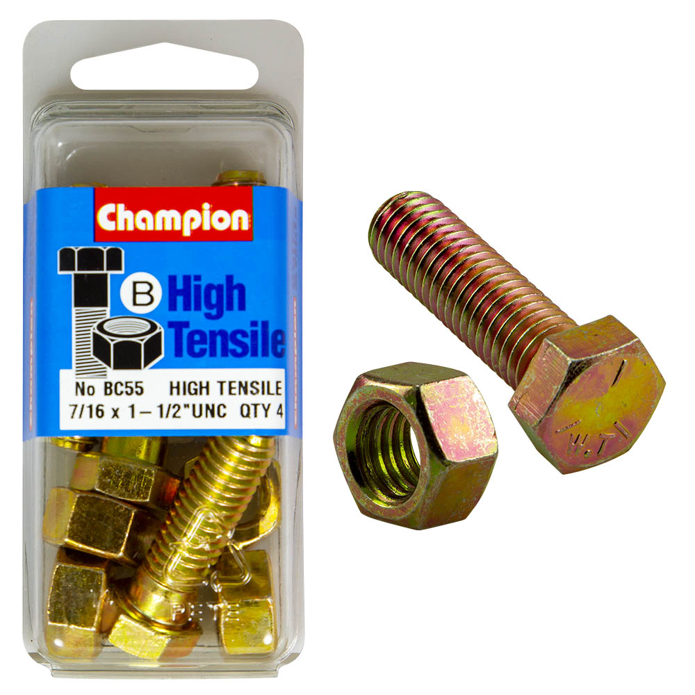 Industrial Shed proudly distributes Champion - HEX BOLTS & NUTS - HIGH TENSILE - 7/16" x 1-1/2" - UNC - GRADE 5 | BC55 by Champion Fasteners, delivering unmatched durability and strength for heavy-duty applications. Perfectly engineered for construction, automotive, and industrial projects, these high tensile bolts and nuts provide the reliability you need for secure fastening.