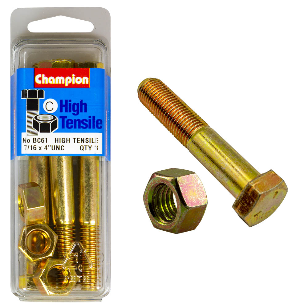 Industrial Shed proudly distributes Champion - HEX BOLTS & NUTS - HIGH TENSILE - 7/16" x 4" - UNC - GRADE 5 | BC61 by Champion Fasteners, delivering exceptional strength and reliability for various heavy-duty applications.