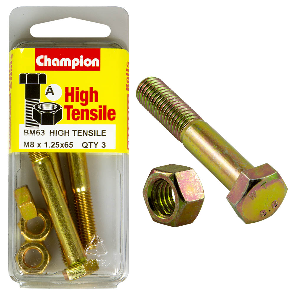 Industrial Shed proudly distributes Champion - HEX BOLTS & NUTS - HIGH TENSILE - M8 x 65mm - GRADE 8.8 | BM63 by Champion Fasteners, delivering exceptional strength and durability for heavy-duty applications. These high tensile hex bolts are designed for robust fastening solutions in construction, automotive, and industrial settings.
