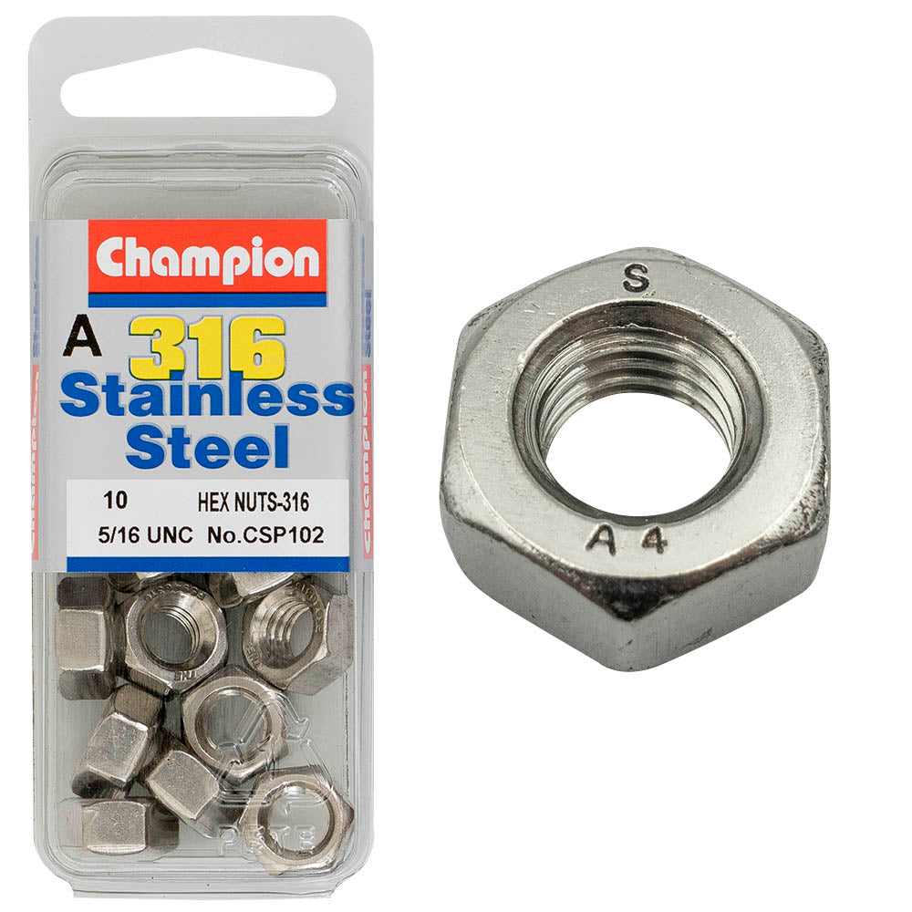 Industrial Shed proudly distributes HEX PLAIN NUTS - STAINLESS STEEL - 5/16" - UNC - 316/A4 by Champion Fasteners, delivering superior corrosion resistance for marine and industrial applications. Crafted from high-quality A4 stainless steel, these nuts ensure durability and reliability in challenging environments.
