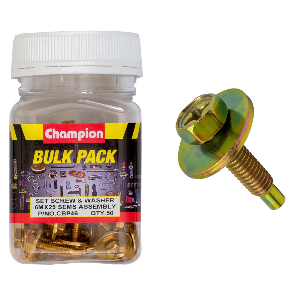 Industrial Shed proudly distributes Champion - HEX SET SCREWS SEMS HEX COMBO DVE FLAT WASHERS PILOT M6 x 25mm | CBP46 by Champion Fasteners, delivering exceptional strength and reliability for all your fastening needs. Ideal for a variety of applications, these hex set screws are designed to provide the ultimate in performance in any construction environment.