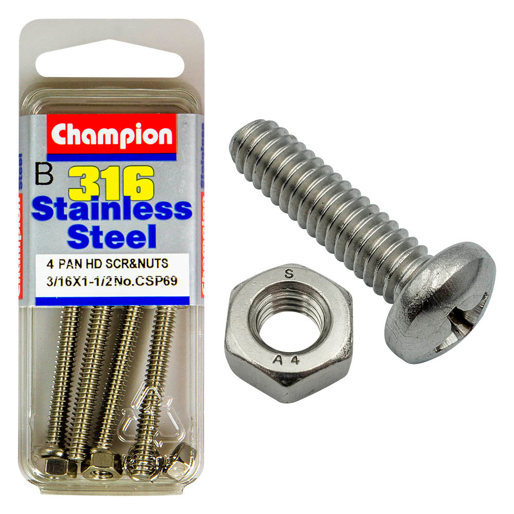 Champion - MACHINE SCREWS & NUTS-PAN-PHILLIPS-STAINLESS STEEL-3/16"x1-1/2"-316/A4 | CSP69