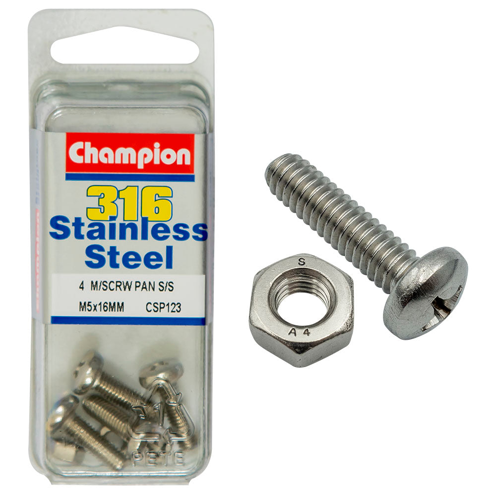 Industrial Shed proudly distributes Champion - MACHINE SCREWS PAN PHILLIPS STAINLESS STEEL M5 x 16mm 316/A4 | CSP123 by Champion Fasteners, delivering exceptional strength and corrosion resistance for a variety of fastening applications. These machine screws are designed for both indoor and outdoor use, ensuring durability in even the harshest environments.