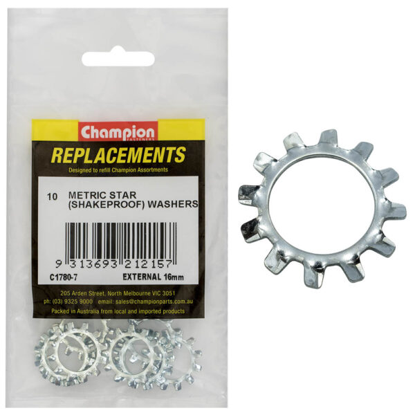 Industrial Shed proudly distributes Champion - WASHERS-SHAKEPROOF-EXTERNAL-16mm-ZINC PLATED | C1780-7 by Champion Fasteners, delivering unbeatable stability and security for your construction and maintenance projects. These shakeproof washers are designed to prevent loosening due to vibrations and ensure a strong, lasting hold.