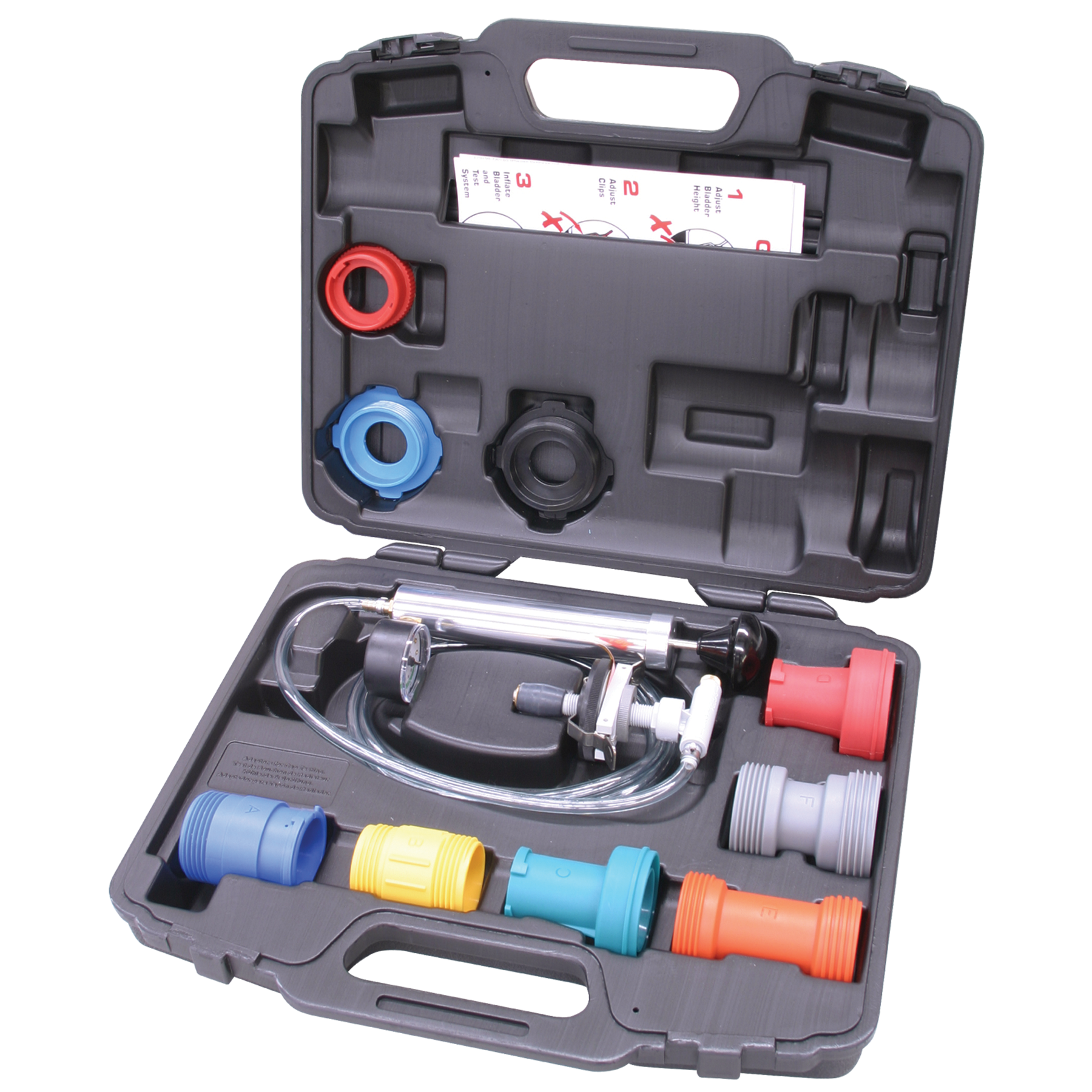 The Deluxe Cooling System Pressure Tester eliminates the need for adapters, allowing for quick and efficient pressure testing of the cooling system. Its inflatable bladder sealing system ensures a secure connection, making it compatible with most passenger and light commercial vehicles. Ideal for testing radiator and header tank pressures without the hassle of additional adapters.