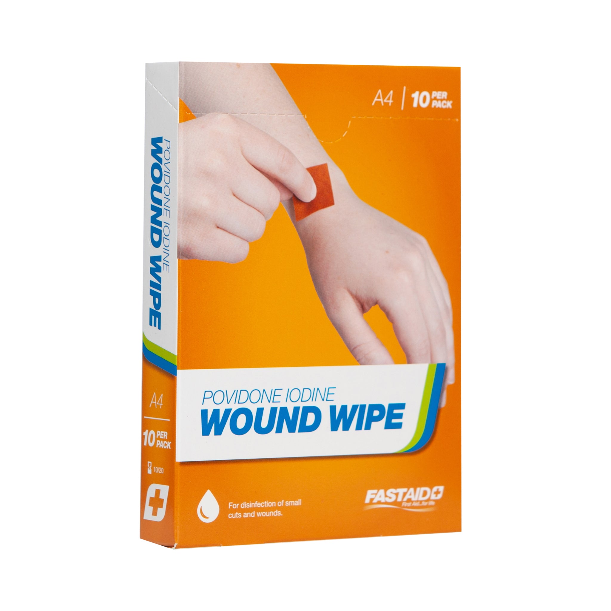FastAid's povidone iodine swab wound wipe is designed to disinfect areas of skin to prevent bacterial infections in and around the wound and prepare wound for dressing. Contains 10pk easy access povidone iodine wound swab. Packed in FastAid's unique colour coded retail packaging, complete with easy-to-open box perforation. Also compatible as a refill for FastAid's Easy-Refill™ First Aid Kits. Available from Industrial Shed — Mornington Peninsula trade supplies for FastAid kits, tools, and site gear.