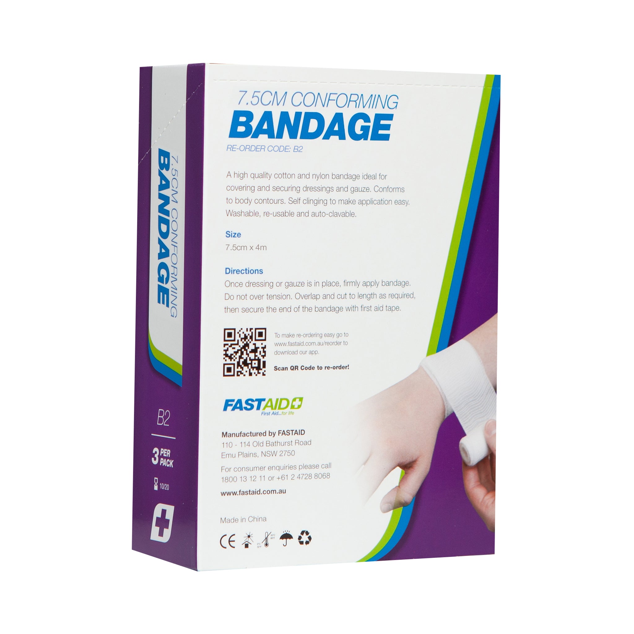 FastAid's conforming bandages are a quality cotton and nylon bandage ideal for covering and securing dressings and gauze. Conforms to body contours and self-clinging to make application easy. Also washable, re-usable and autoclavable. Contains 3 x 7.5cm conforming bandages 4m in length in an easy-to-open flow wrap package. Packed in FastAid's unique colour coded retail packaging, complete with easy-to-open box perforation. Also compatible as a refill for FastAid's Easy-Refill™ First Aid Kits. Available from Industrial Shed — Mornington Peninsula trade supplies for FastAid kits, tools, and site gear.