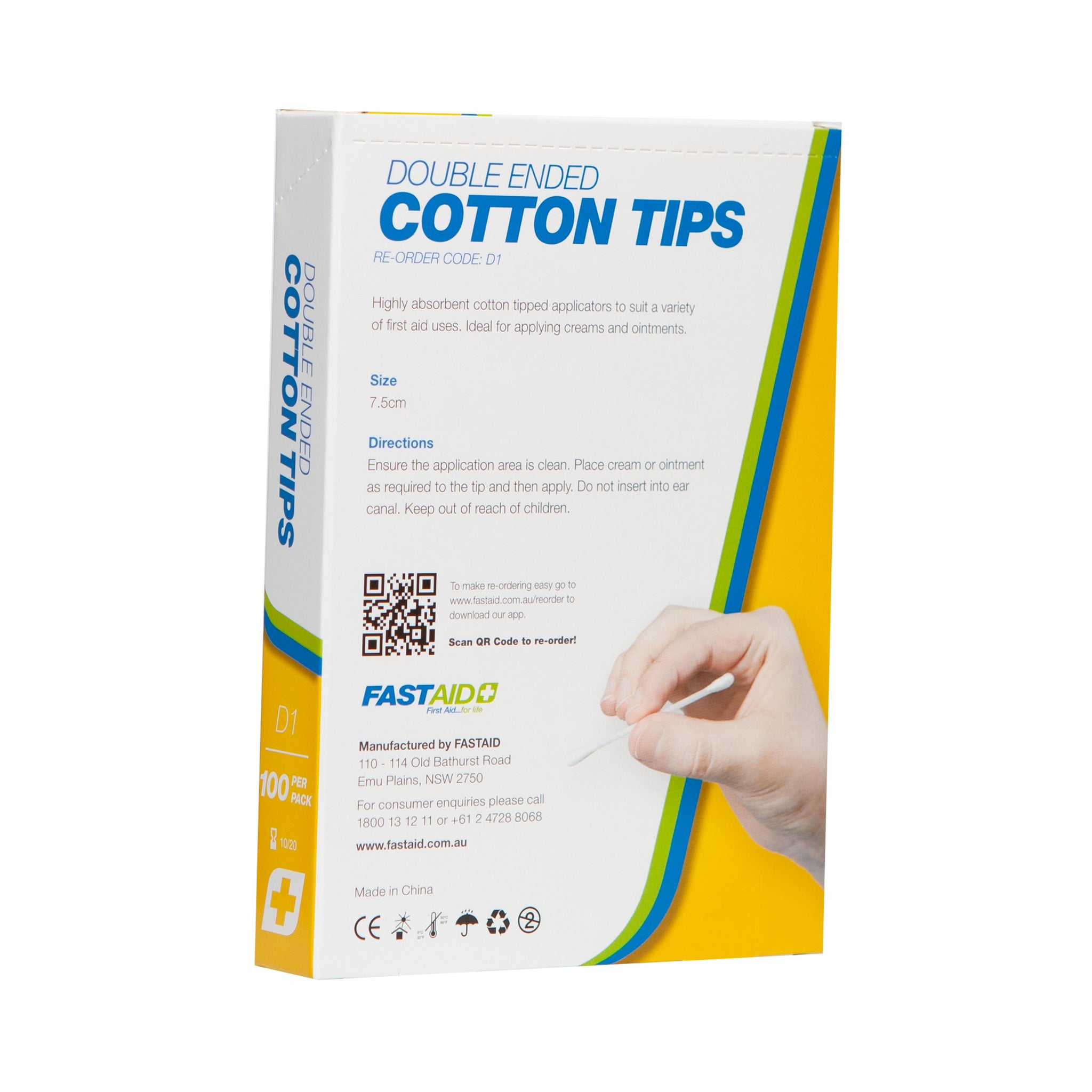 FastAid's highly absorbent bamboo cotton tipped applicators are designed to suit a variety of first aid uses such as applying creams and ointments. Contains 100 x 7.5cm double ended cotton tipped applicators packed in a resealable bag. Packed in FastAid's unique colour coded retail packaging, complete with easy-to-open box perforation. Also compatible as a refill for FastAid's Easy-Refill™ First Aid Kits. Available from Industrial Shed — Mornington Peninsula trade supplies for FastAid kits, tools, and site gear.