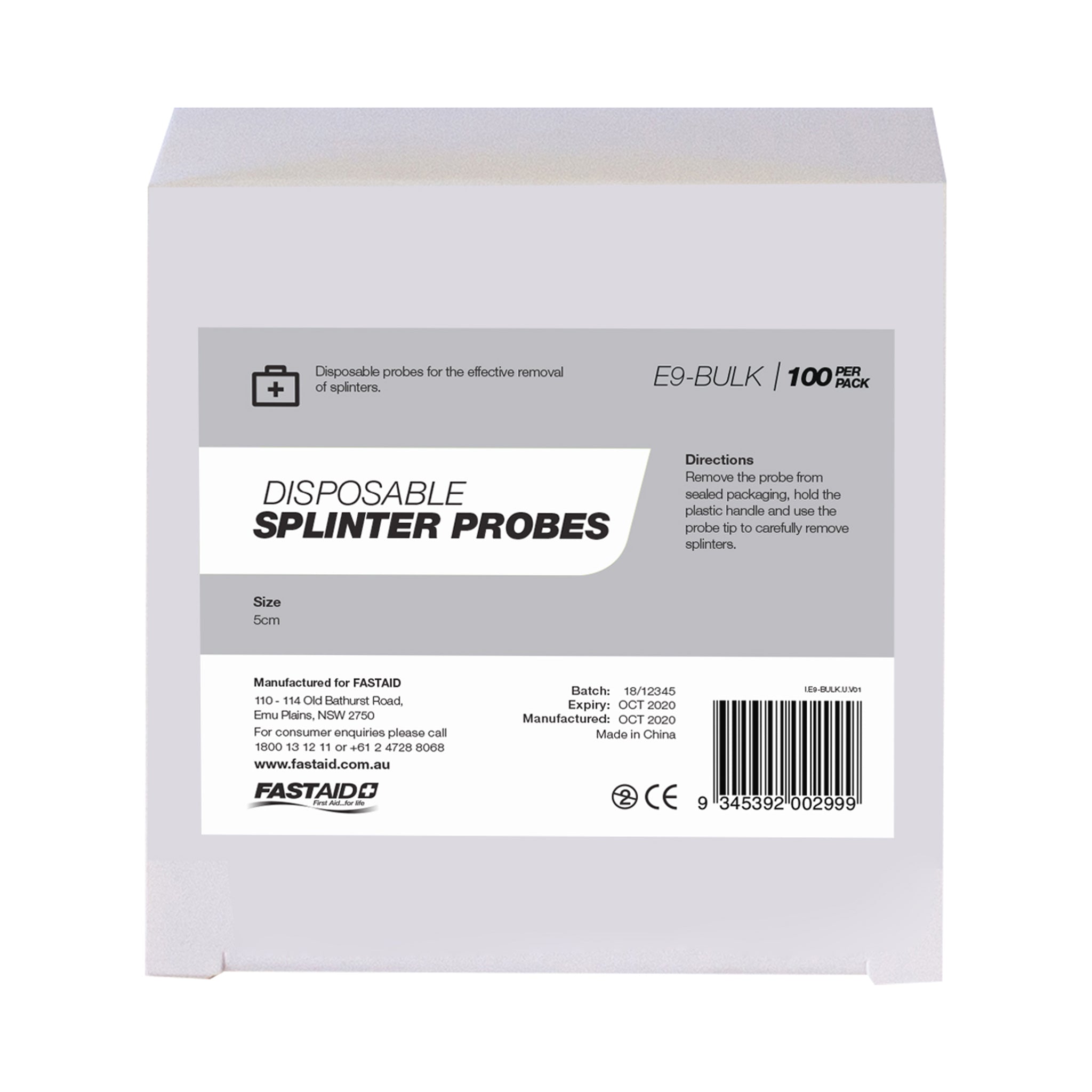 FastAid's disposable splinter probes are designed for ease and precision in removing splinters effectively. Contains 100 disposable splinter probes. 5 probes per blister pack sheet, 20 sheets per box. Bulk pack is ideal for people replenishing a first aid kit and is packed in a cardboard dispenser box. Available from Industrial Shed — Mornington Peninsula trade supplies for FastAid kits, tools, and site gear.