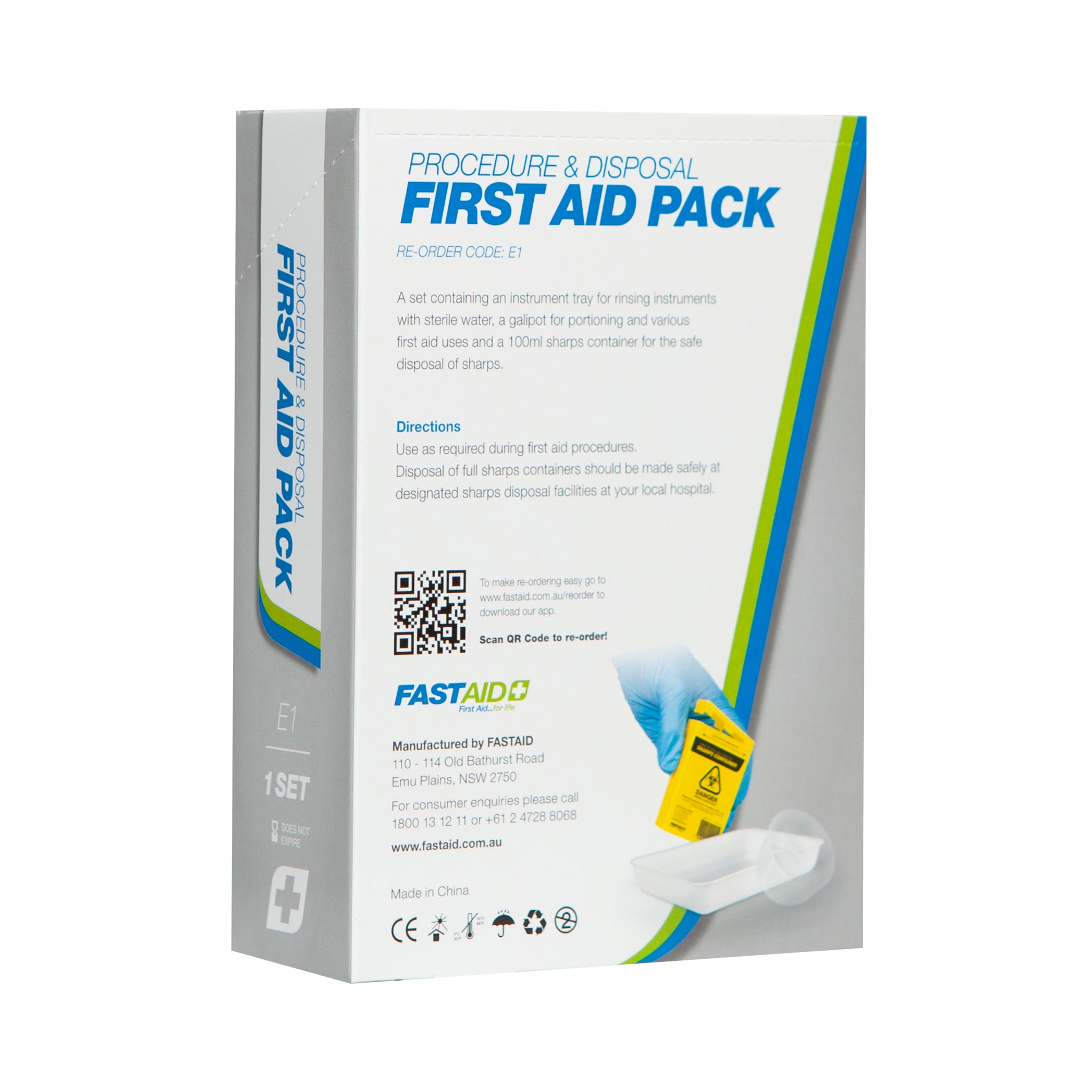 FastAid's procedure and disposal first aid pack contains essential items to assist with first aid procedures and the safe disposal of sharps waste. Includes 100ml plastic sharps container for the safe disposal of contaminated sharps. Includes a 60ml clear plastic galipot with measurement markings on the side, ideal for containing liquids and ointments during first aid procedures. Includes a white plastic instrument tray measuring 13 (W) x 9.8 (D) x 2 (H) cm, which is used for holding instruments and dressings during first aid procedures. Packed in FastAid's unique colour coded retail packaging, complete with easy-to-open box perforation. Also compatible as a refill for FastAid's Easy-Refill™ First Aid Kits. Available from Industrial Shed — Mornington Peninsula trade supplies for FastAid kits, tools, and site gear.