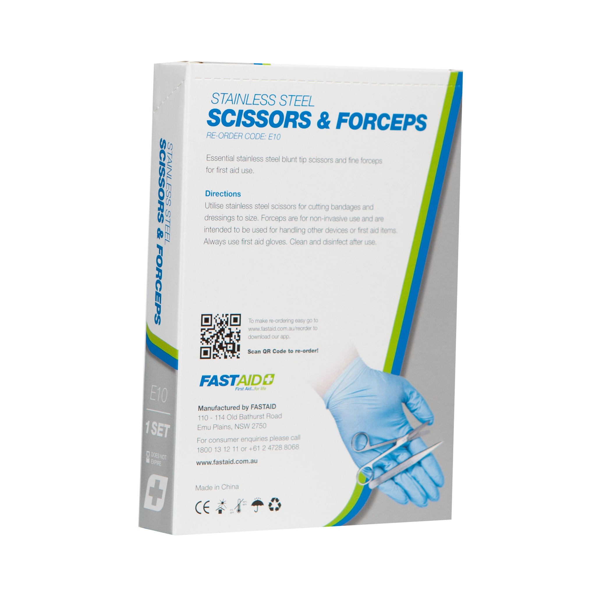 FastAid's instrument set contains 12.5cm stainless steel blunt tip scissors for cutting bandages and dressings during first aid procedures. Also contains 12.5cm stainless steel fine tip forceps for handling dressings and other first aid devices during treatment. Contains 1 x 12.5cm stainless steel scissors and 1 x 12.5cm forceps. Packed in FastAid's unique colour coded retail packaging, complete with easy-to-open box perforation. Also compatible as a refill for FastAid's Easy-Refill™ First Aid Kits. Available from Industrial Shed — Mornington Peninsula trade supplies for FastAid kits, tools, and site gear.