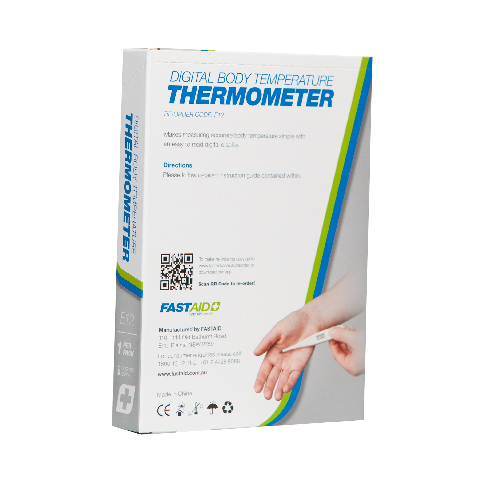 FastAid's digital thermometer is designed to measure human body temperatures within the range of 32.0 - 42.9 ℃. Includes a memory function to display the last measured temperature. Auto-off function and long-lasting battery provides up to 100 hours of use time. Includes detailed product manual. Packed in FastAid's unique colour coded retail packaging, complete with easy-to-open box perforation. Available from Industrial Shed — Mornington Peninsula trade supplies for FastAid kits, tools, and site gear.