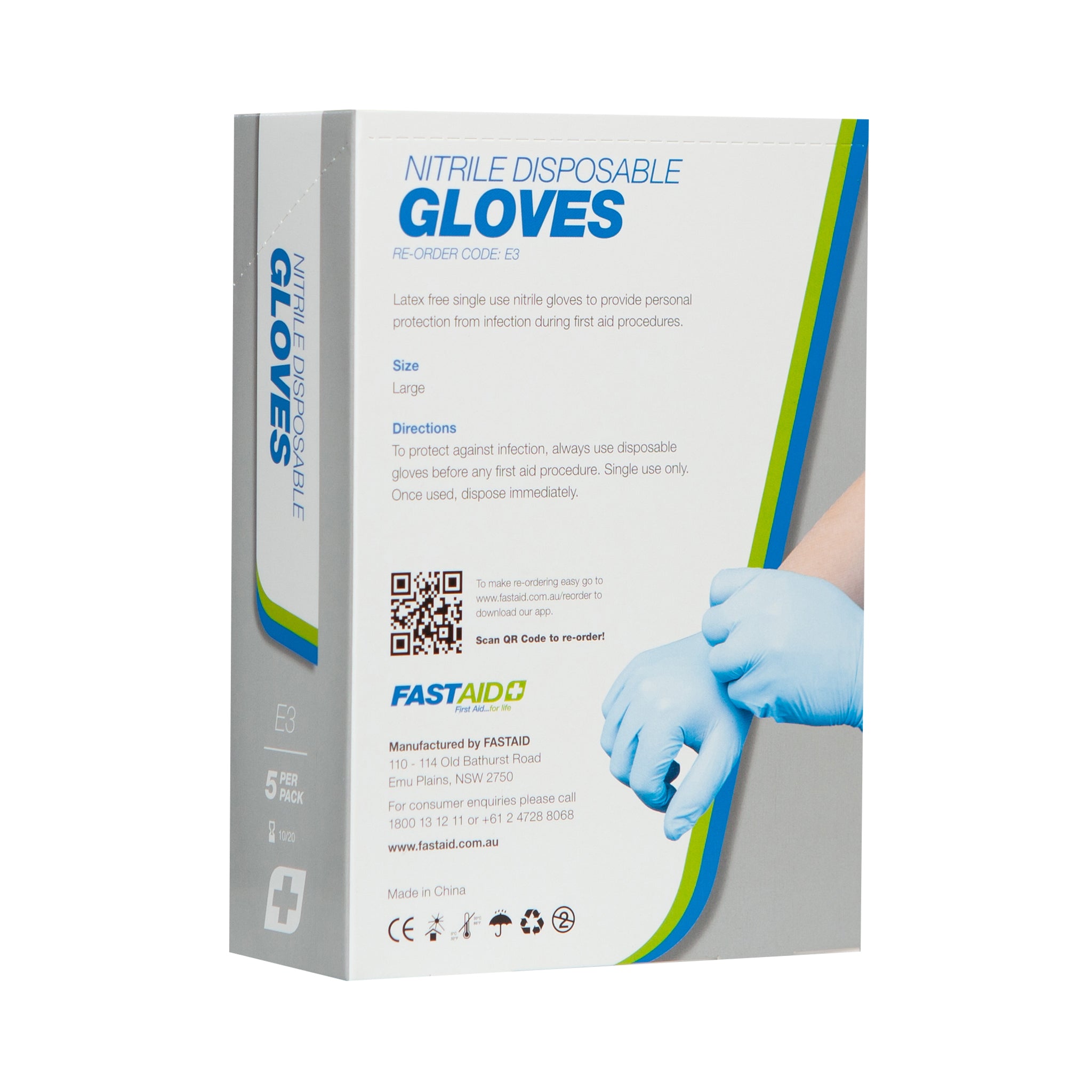 FastAid's large nitrile disposable gloves are latex free single use gloves designed to provide personal protection from infection during first aid procedures. Contains 5 pairs of nitrile disposable gloves individually packed as pairs. Packed in FastAid's unique colour coded retail packaging, complete with easy-to-open box perforation. Also compatible as a refill for FastAid's Easy-Refill™ First Aid Kits. Available from Industrial Shed — Mornington Peninsula trade supplies for FastAid kits, tools, and site gear.