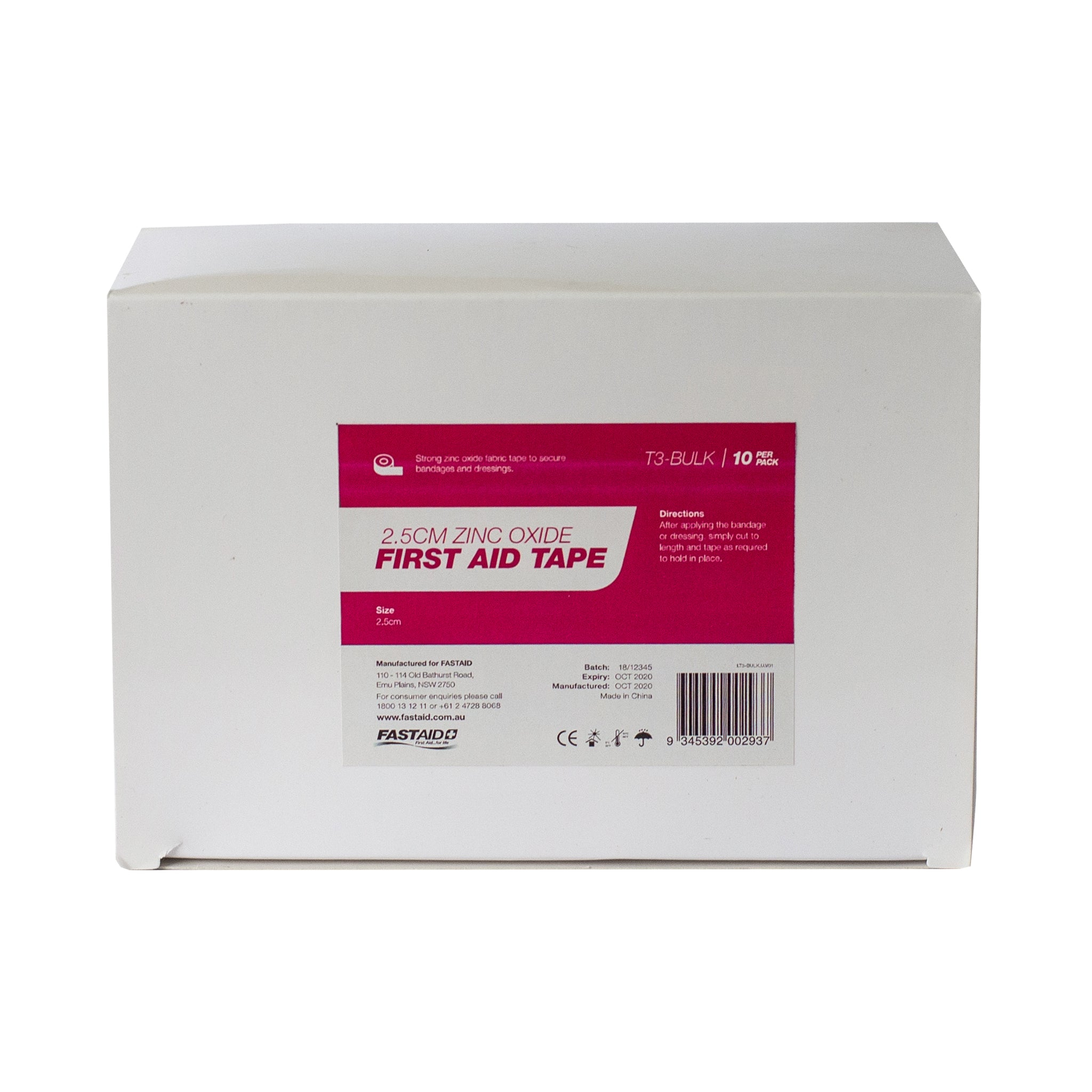 FastAid's fabric zinc oxide tape is a durable hypoallergenic adhesive tape suitable for securing dressings to the skin and strapping joints and sporting injuries. Comes supplied on individual spools for ease of dispensing and includes a cap to ensure the tape is kept in optimum condition. Contains 12 rolls of 2.5cm x 5m tape. This bulk pack is ideal for people replenishing a first aid kit and is packed in a cardboard box. Available from Industrial Shed — Mornington Peninsula trade supplies for FastAid kits, tools, and site gear.