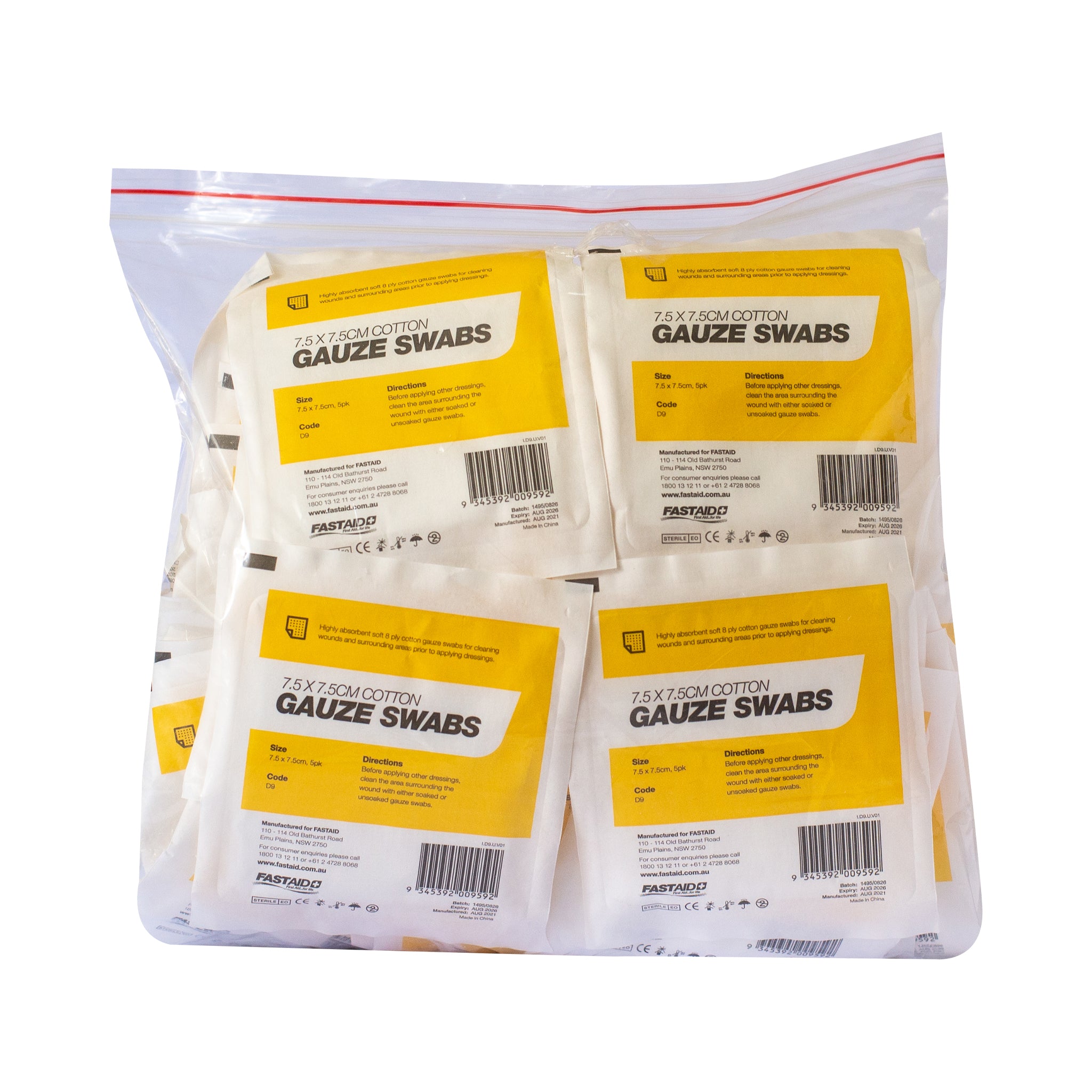FastAid's gauze swabs are highly absorbent, soft 8 ply cotton gauze, and are for cleaning wounds and surrounding areas. Contains 50 sterile pouches, each containing 5 absorbent gauze swabs. Bulk pack is ideal for first aid kit replenishment and is packed in a resealable clip seal bag. Available from Industrial Shed — Mornington Peninsula trade supplies for FastAid kits, tools, and site gear.