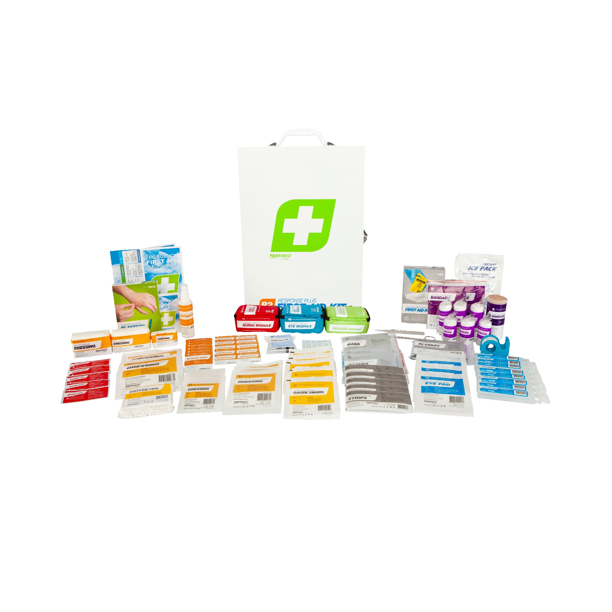 The FastAid R2 Response Plus™ first aid kit is a premium-quality kit designed for both low and high-risk workplaces, exceeding the WHS requirements for Australian workplaces across most industries. This first aid kit complies with WHS regulations for workplaces with 1-25 persons and includes specific first aid items for treating injuries common in higher risk environments where equipment and machinery is used. A comprehensive range of premium hospital grade contents are included in the FastAid R2 Response Plus™ kit, as well as three additional modules for treating burn injuries, eye injuries and outdoor risks such as snake and spider bites. Includes extras such as hydrogel burn gels and dressings for effective burns treatment, including treatment guides. Includes a full colour snake and spider bite identification and treatment guide and appropriate contents to effectively treat bites. Unique colour coded contents make locating the right item in an emergency faster and easier. FastAid's first aid metal wall cabinets are built from a heavier gauge steel than standard to ensure they stand up to the rigours of the workplace. The organisation sleeve on the inside of the cabinet door provide space for you to place your high use first aid items and treatment guidance to ensu(more...) Available from Industrial Shed — Mornington Peninsula trade supplies for FastAid kits, tools, and site gear.