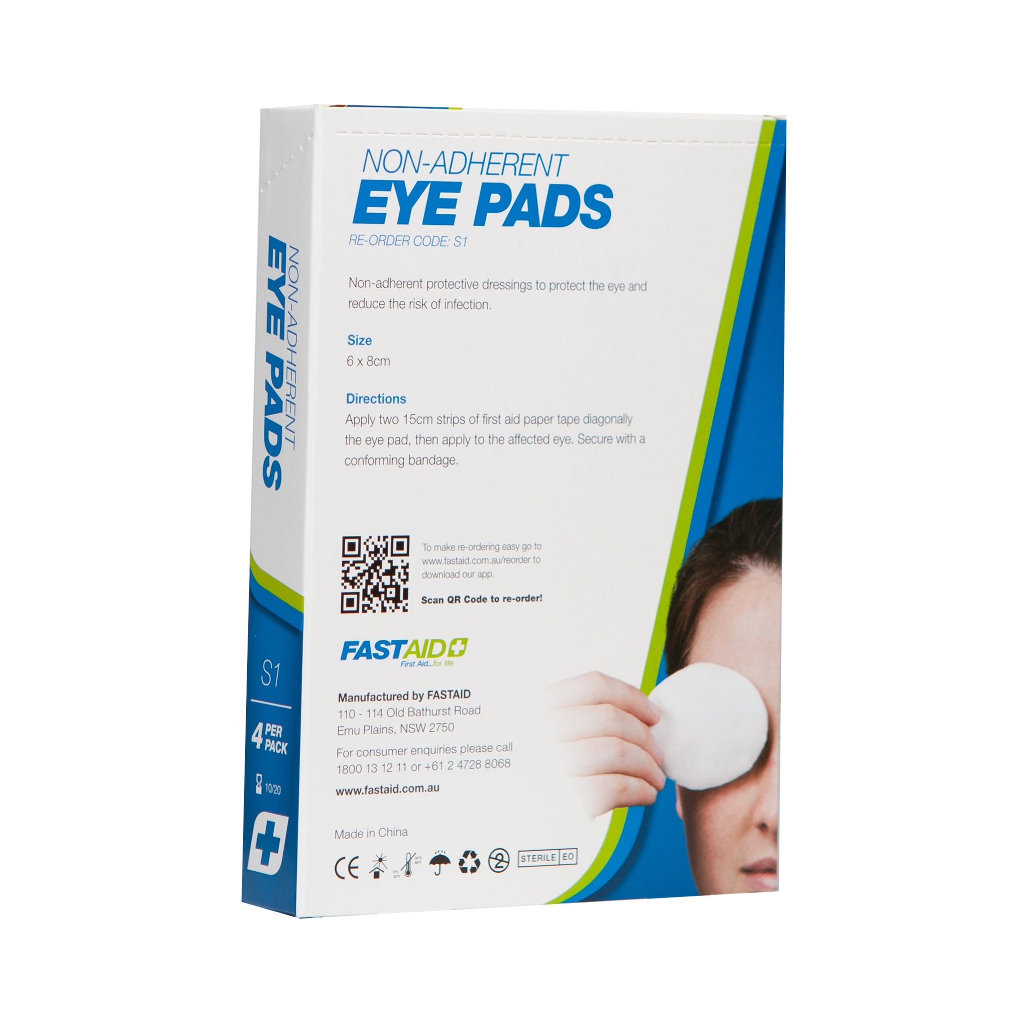 FastAid's non-adherent eye pads are designed to protect the eye post-injury while reducing the risk of infection. Contains a non-abrasive outer layer soft on delicate skin and an absorbent inner layer. Contains 4 eye pads in easy to open individually wrapped sterile pouches. Packed in FastAid's unique colour coded retail packaging, complete with easy-to-open box perforation. Also compatible as a refill for FastAid's Easy-Refill™ First Aid Kits. Available from Industrial Shed — Mornington Peninsula trade supplies for FastAid kits, tools, and site gear.