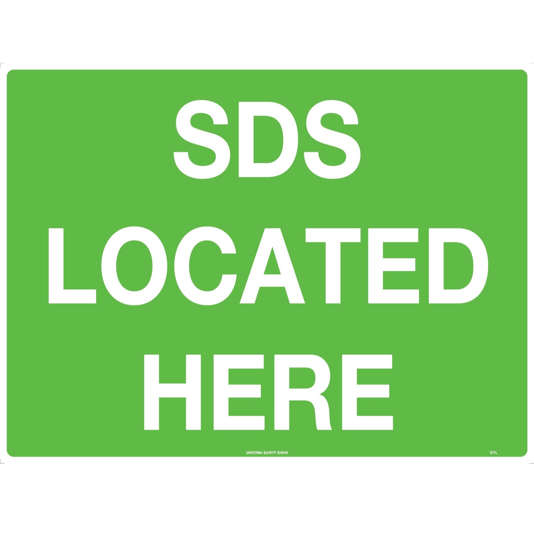 The FastAid SDS Located Here Sign clearly communicates details of location for SDS's in the workplace. A highly visible design ideal for wall mounting outside the location of the SDS storage area. Made from durable 1.4mm polypropylene material. Dimensions: 600 (W) x 400 (H) mm Available from Industrial Shed — Mornington Peninsula trade supplies for FastAid kits, tools, and site gear.