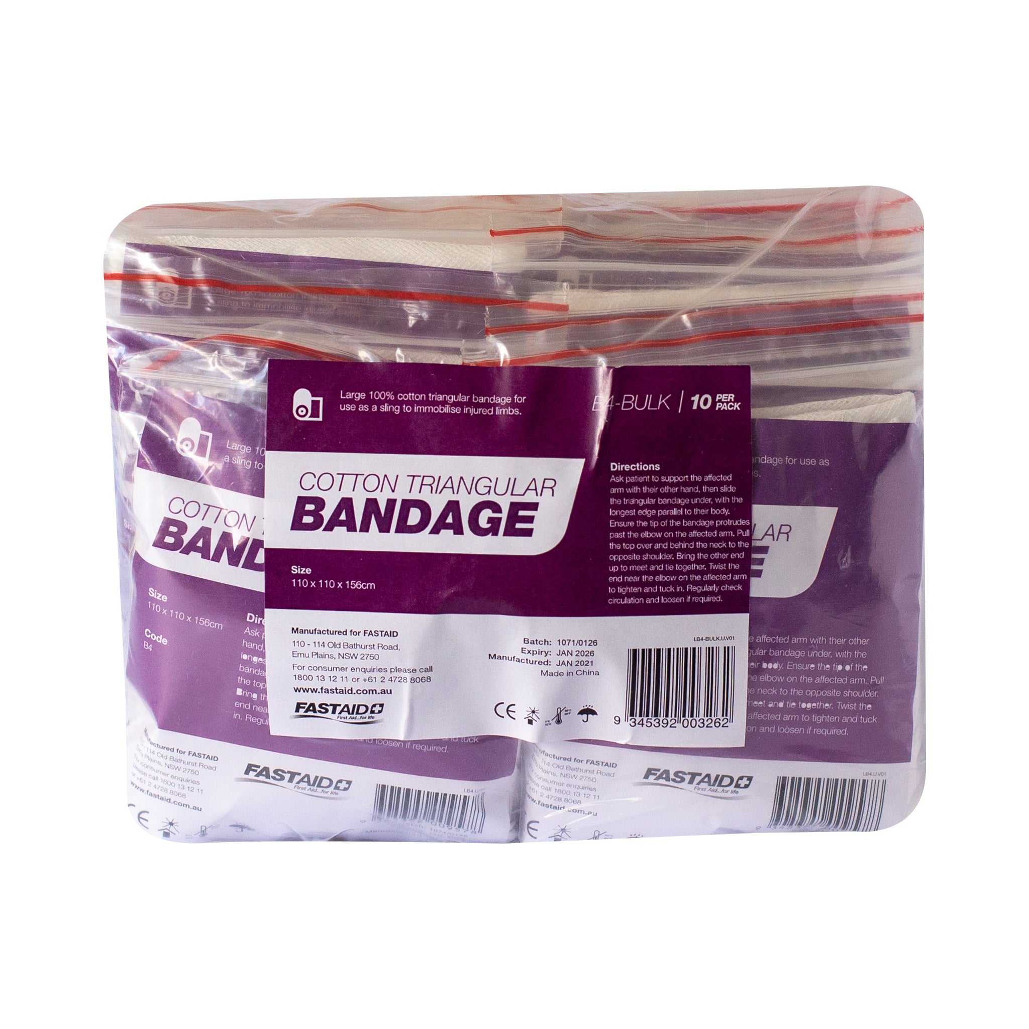 FastAid's cotton triangular bandages are 100% cotton sling designed to immobilise injured limbs, aiding in the prevention of further damage of a limb as movement is minimised. Contains 10 triangular cotton bandages measuring 110 x 110 x 156cm. This bulk pack is ideal for people replenishing a first aid kit and is packed in a resealable clip seal bag. Available from Industrial Shed — Mornington Peninsula trade supplies for FastAid kits, tools, and site gear.