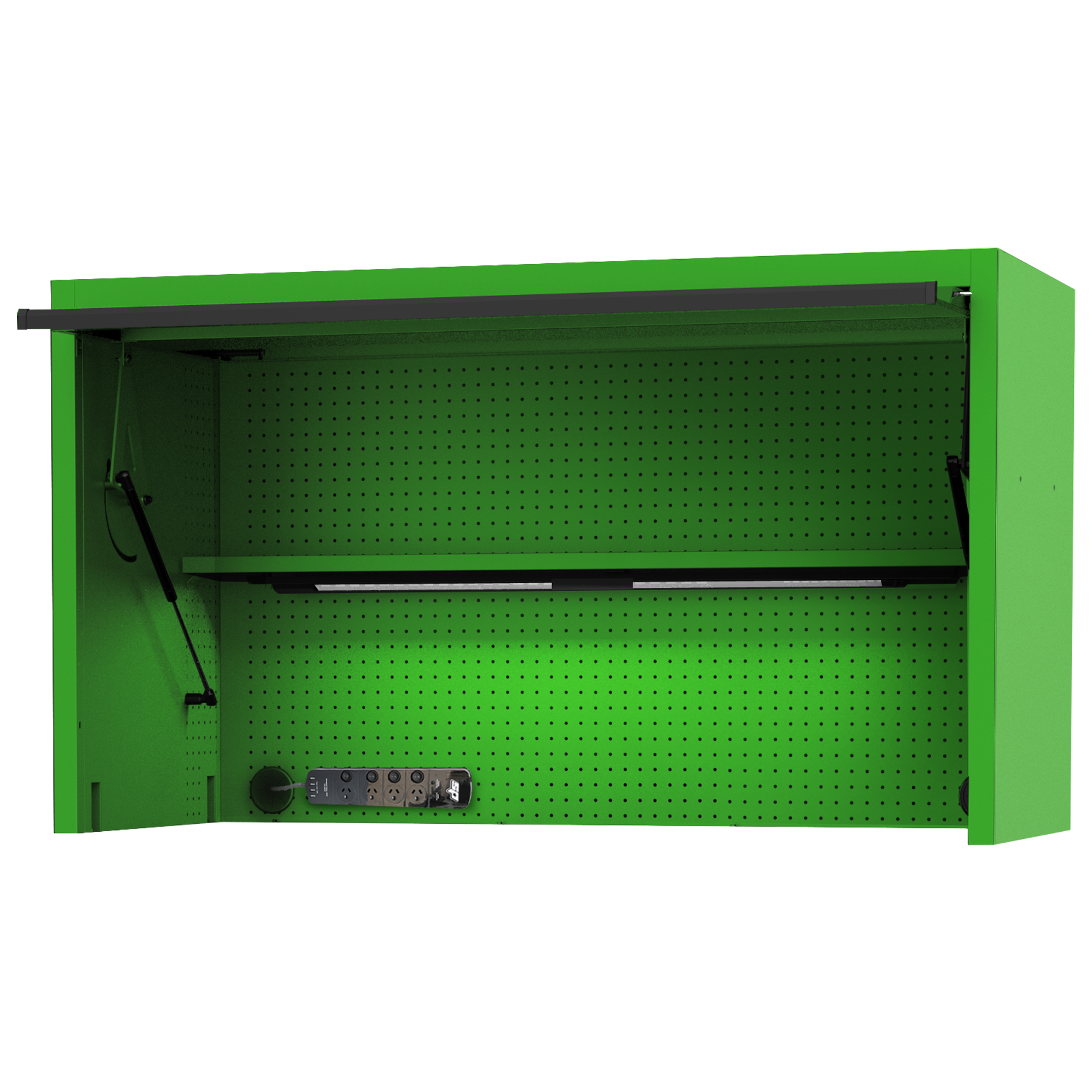 Engineered for serious tradespeople, the 59" USA Sumo Series Wide Power Top Hutch in bold Green/Black delivers superior durability, high visibility, and unmatched utility. Designed to enhance your workspace with power, light, and smart tool organization.