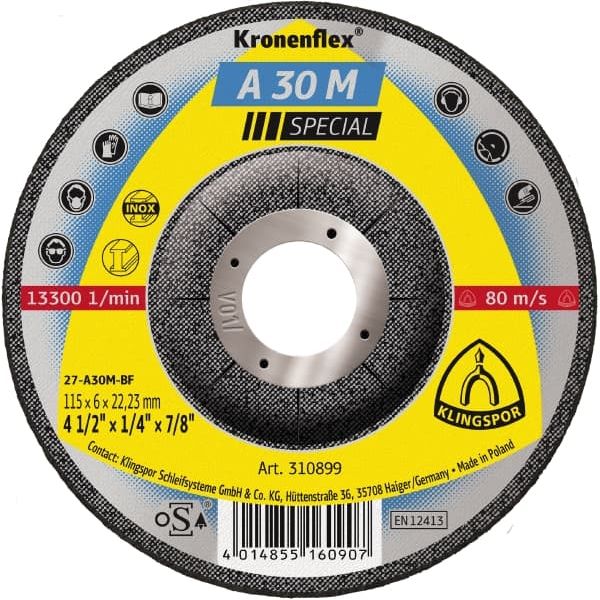 A 30 M grinding discs, 125 x 6 x 22,23 mm depressed centre. Engineered for maximum cut rate and long life, trusted by professionals in workshops and on-site jobs.