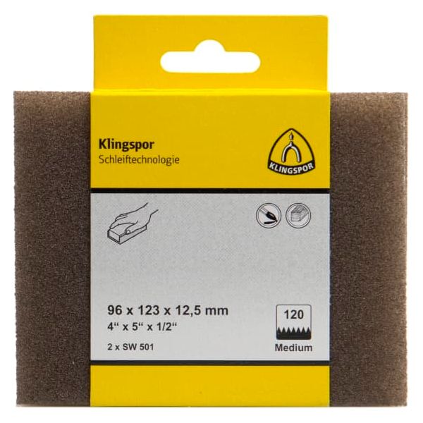SW 501 abrasive sponge, flexible, 96 x 123 x 12.5 mm grain 220, D.I.Y.-packaged with tab. Engineered for maximum cut rate and long life, trusted by professionals in workshops and on-site jobs.