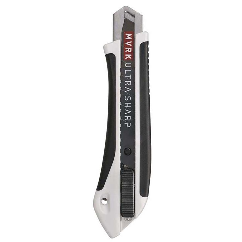 A heavy-duty utility knife engineered for maximum cutting performance and secure handling. The MVRK 18mm Ultra Sharp Sure Grip Auto Lock Snap Knife features an ultra-sharp 18mm snap-off blade with an automatic lock mechanism and a textured sure-grip handle for superior control and comfort during extended use.