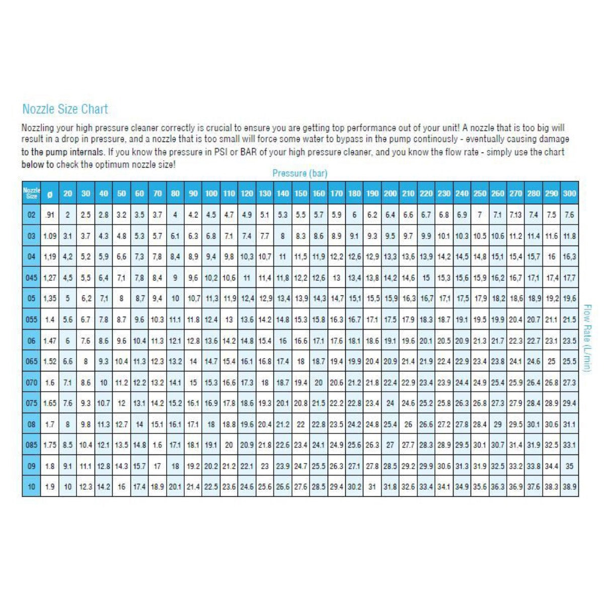 With a narrower spray pattern than the 40° nozzle & with a more concentrated spray pressure, this nozzle is best suited for flushing dirt, mud & grim. Stainless Steel Nozzle, Max Pressure & Flow Rate please see Nozzle Size chart
