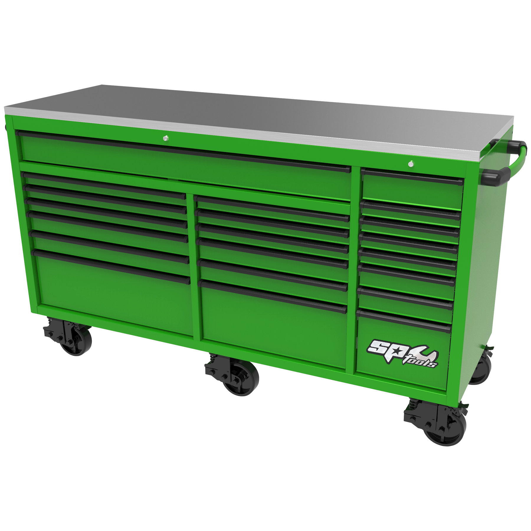 From its bold green and black finish to its next-level construction, this 73" USA Sumo Series Roller Cabinet is built to perform and made to last—an essential upgrade for any tradesperson’s workspace.