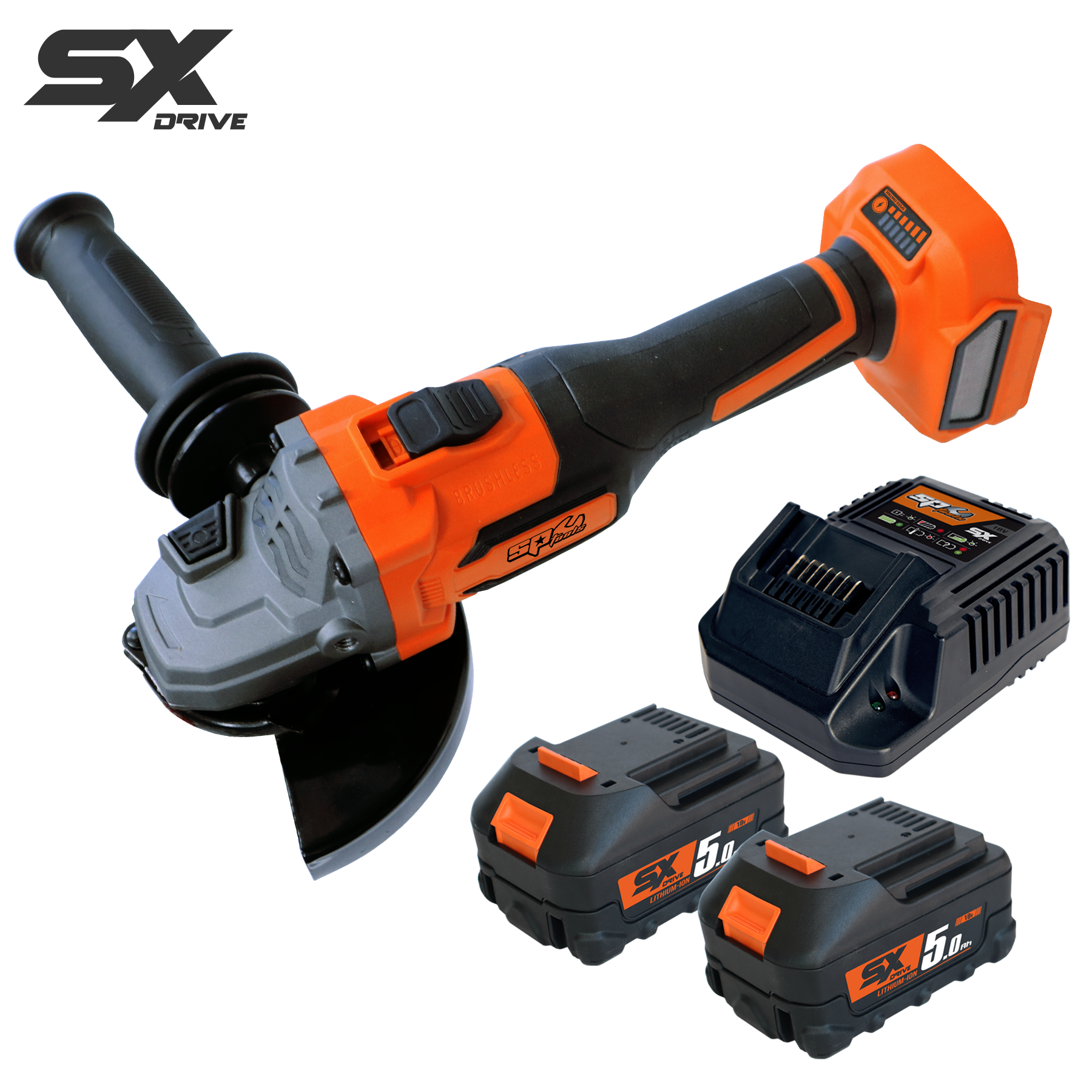 SP Cordless 18V 5" Brushless Angle Grinder by SP Tools, featuring a slide switch and dual 5.0Ah batteries with charger, delivers cordless, brushless power for demanding grinding tasks on the job site.