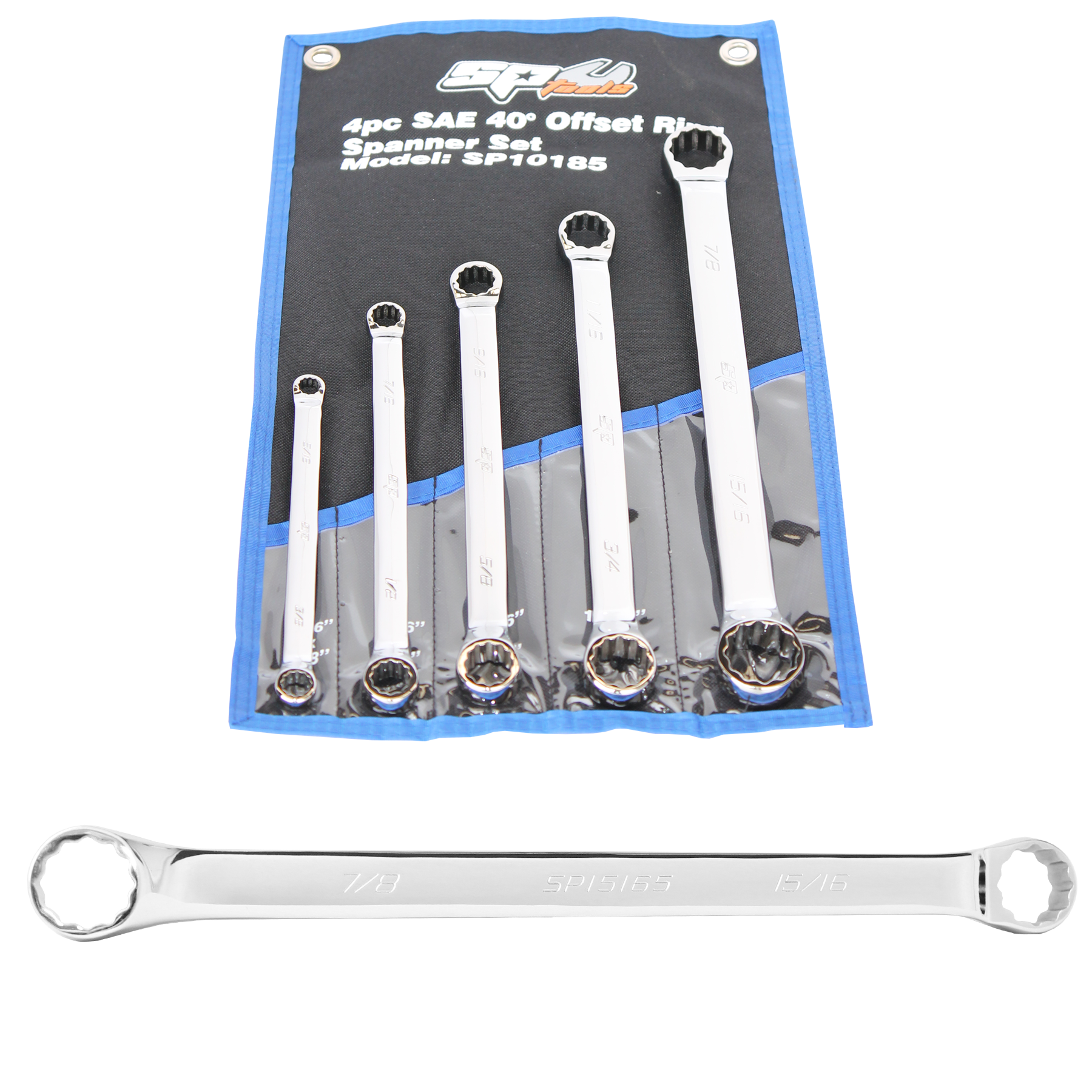 5Pc Sae 40° Offset Ring Spanner Set • 5/16X3/8 7/16X1/2 9/16X3/8 11/16X3/4 & 7/8X5/16" • Chrome Vanadium Steel For High Durability. • Dual Flat Drive Technology.