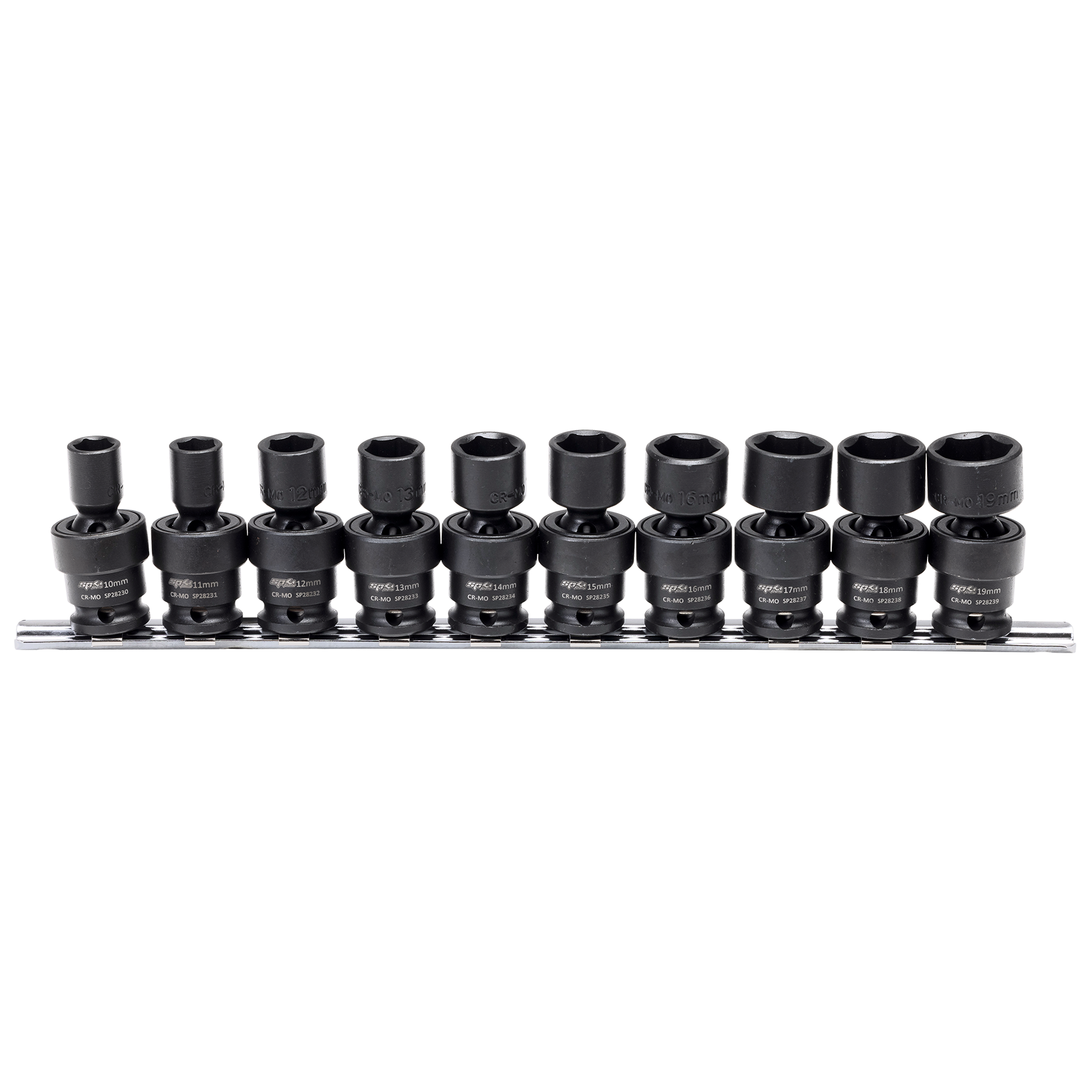 3/8”Dr Swivel Impact Sockets • Flat Drive Technology Offers Maximum Contact And Grip • Smooth Swivel Action With A 30° Flex Angle Makes These Impact Sockets Ideal For Working In Tight Confined Areas • Trade Tough - Suitable For Use With Pneumatic And Electric/Cordless Impact Wrenches • Premium Quality, High Strength Chrome Molybdenum Steel (Cr-Mo) For Extreme Durability • Manufactured To Din Standards • 10 11 12 13 14 15 16 17 18 & 19mm • 1 X Socket Rail