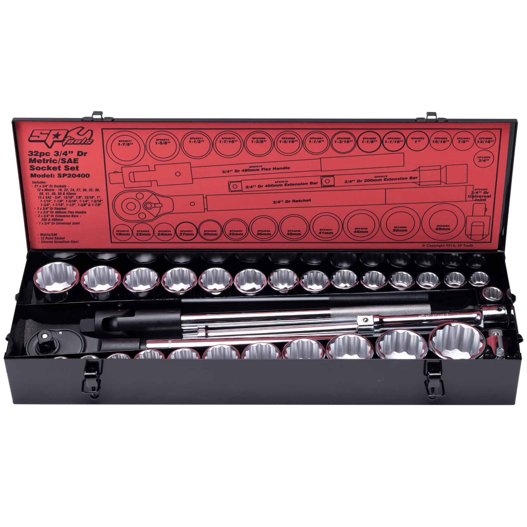32Pc 3/4"Dr 12Pt Socket Set • 19-55mm Metric • 3/4 - 1-7/8" Sae • Chrome Vanadium Steel For High Durability • Flat Drive Technology To Maximize Grip