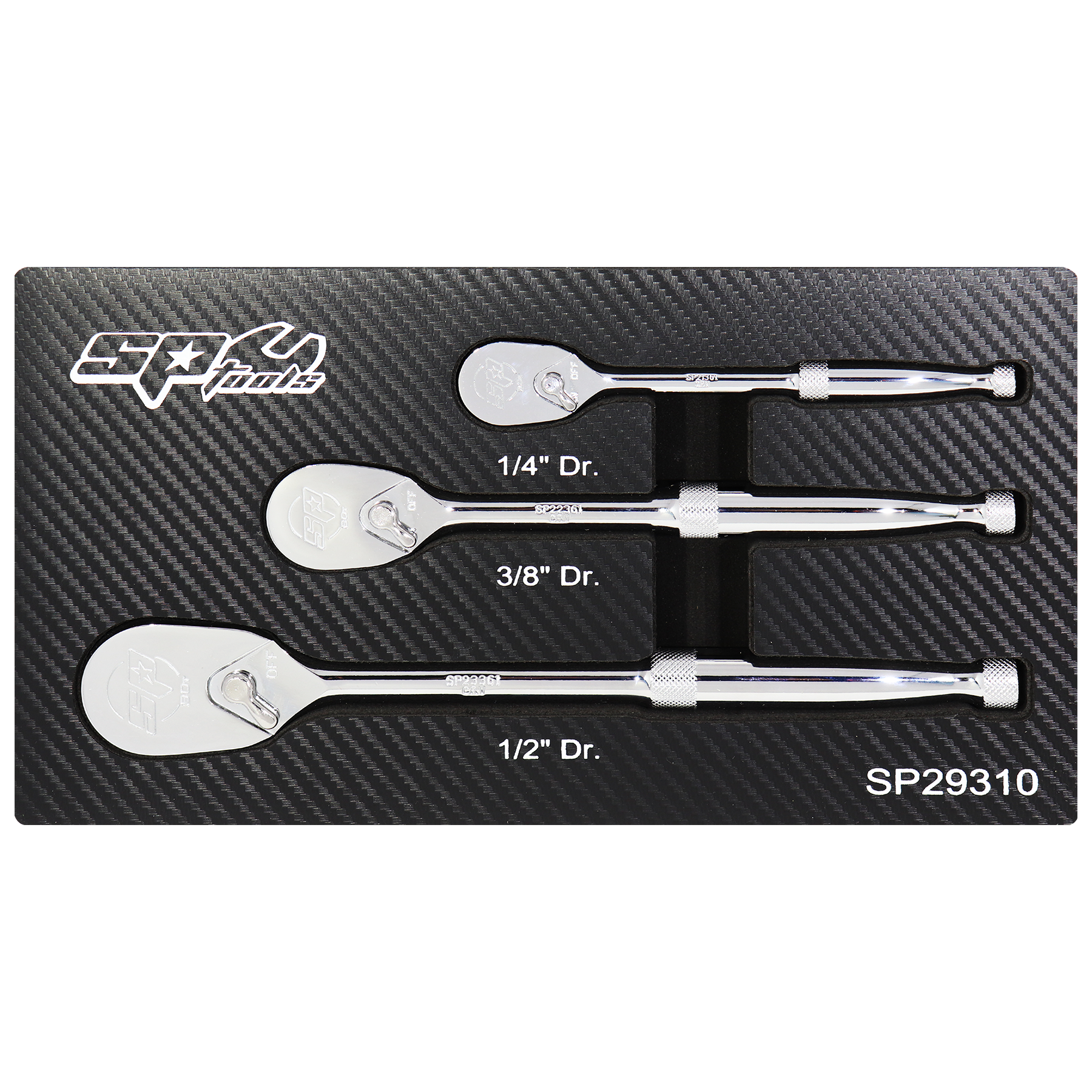 • Sets Icludes 1/4”, 3/8” And 1/2” Drive Ratchets • 90 Tooth Gear For 4° Swing Angle • Compact Oval Ratchet Head For Better Accessibility • Sealed Ratchet Head To Reduce Internal Wear And Tear